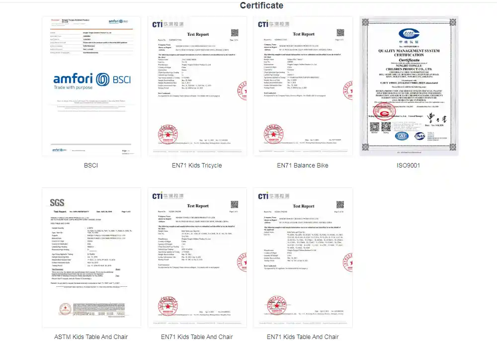 Sertifikatai, tokie kaipEN71irASTMnurodo, kad mūsųvaikų ir mažylių triratukas „for“ buvo atlikti specializuoti bandymai, siekiant nustatyti, ar medžiagos yra netoksiškos, ar kampai nesupjaus rankų, ar dalys tvirtos, ir ar atitiko saugos standartus.